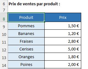 - Puis, nous sélectionnons les cellules de la colonne contenant les prix des produits.