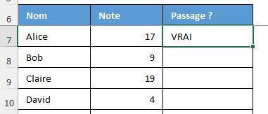 Si la note est supérieure ou égale à 10, la formule renverra la valeur Vrai, sinon elle renverra la valeur Faux.