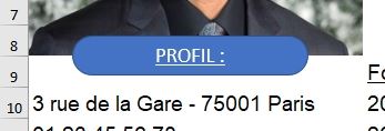 Pour commencer, nous allons mettre en forme la partie haute en centrant le nom et le poste occupé, en agrandissant la police et changeant la couleur du fond et du texte :