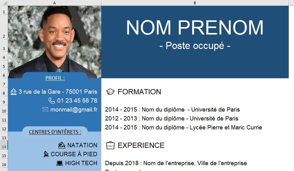 Pour ce tutoriel, nous allons donc partir d’un CV volontairement très simple et peu attrayant afin de découvrir comment le mettre en forme pour en tirer un document moderne et visuellement impactant en utilisant évidemment Excel.