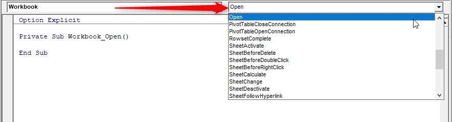 Cela étant fait, nous choisissons l’option Workbook depuis le premier menu déroulant situé au-dessus de la feuille de code :