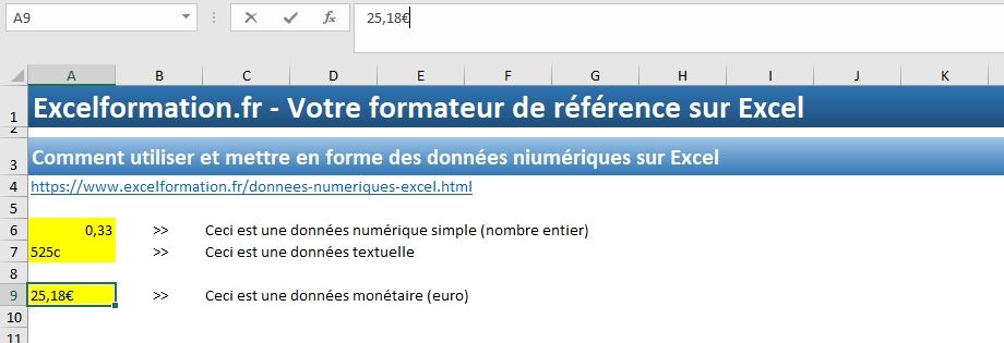 Excel permet de manipuler toutes sortes de données numériques au sein des cellules. Ainsi il est possible d’afficher des données numériques simples (sous la forme d’entiers, ou de valeurs décimales), des données monétaires (dans toutes les devises : euros, dollats), mais également des pourcentages, des dates, des heures,… C’est pourquoi, afin de pouvoir exploiter tout le potentiel offert par le tableur, il est nécessaire de savoir utiliser toutes ces types de données et notamment au niveau de leur affichage au sein des cellules Excel.