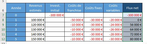 Ce tableau représente les flux de trésorerie pour chaque année de l'investissement dans la franchise de café. L'investissement initial de 300 000 € est effectué en année 0, tandis que les coûts de franchise, les dépenses opérationnelles et les revenus de vente de café sont répertoriés pour les années suivantes.