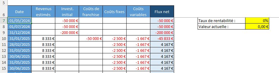 Ensuite, les coûts de franchises sont à régler au début de chaque année, et les revenus, ainsi que les coûts fixes et variables sont mensualisés.