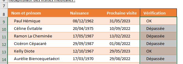 Pour savoir si la personne est à jour, il suffit de comparer les valeurs de la colonne « Prochaine visite » avec la date du jour.
