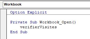 Ensuite, il ne reste plus qu’à demander à Excel, à l’intérieur de cette macro événementielle, d’appeler la macro « verifierVisites » que nous avons créée juste avant :
