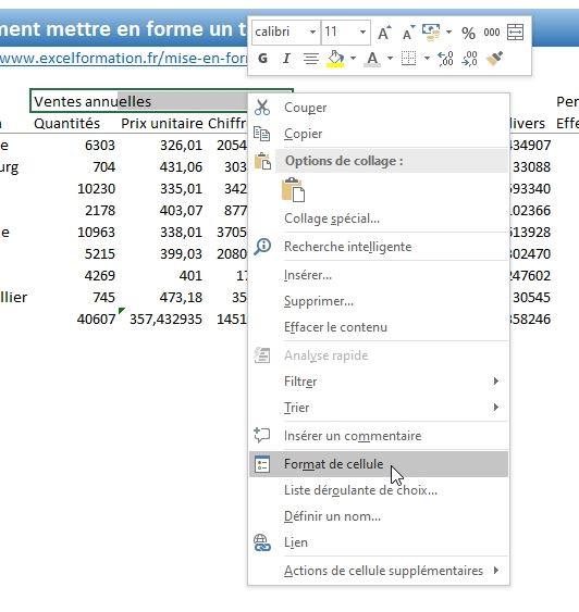 Puis nous effectuons un clic droit, afin de faire apparaitre le menu contextuel > Format de cellule :