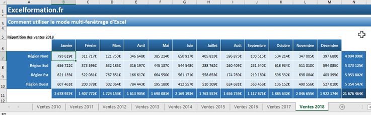 Dans cet exemple qui reprend les ventes mensuelles réalisées par région, chaque feuille de calcul correspond à une année pleine d’activité