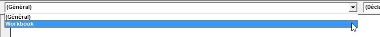 Pour mettre en place cet évènement, nous commençons par sélectionner la liste des évènements des classeurs en choisissant « Workbook » depuis le premier menu déroulant situé au-dessus de la feuille de code :