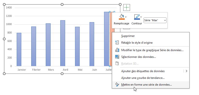 Pour cela, nous cliquons sur la série « Max » dans notre graphique en cliquant sur celle-ci, puis nous effectuons un clic droit afin de sélectionner « Mettre en forme une série de données » :